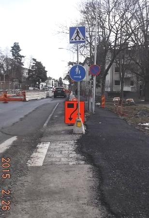 Nedan; fotat 2012-02-21 Skylt saknas som visar på att den nyasfalterade trottoaren till vänster gäller för gående. Många äldre har fortsatt att gå på trottoaren till höger om 50 km skylten. Endast ett körfält där bilarna nu kör med ena sidans hjulpar uppe på trottoaren!!
